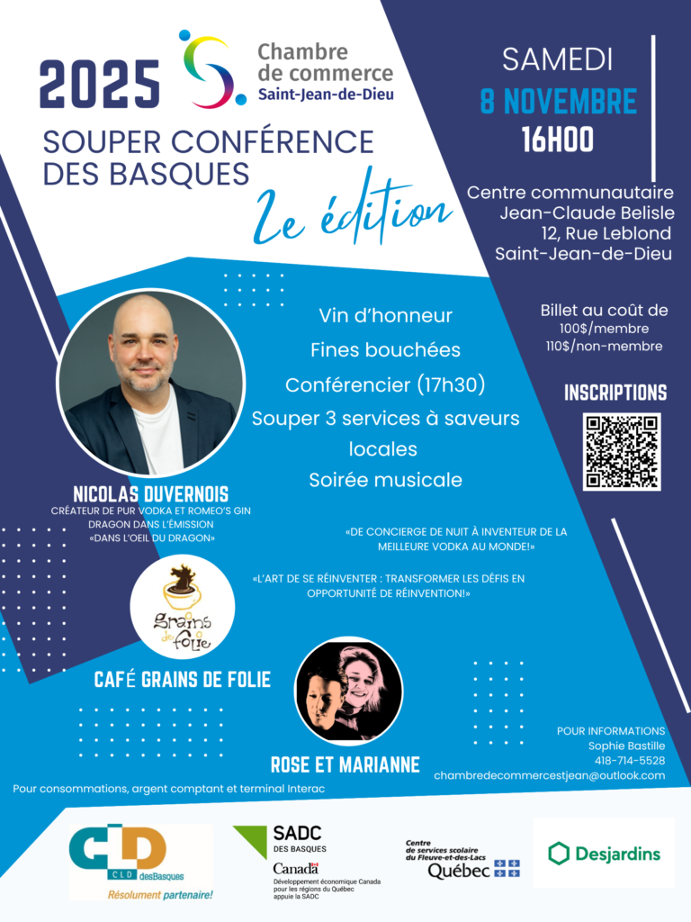 Saint-Jean-de-Dieu, 6 octobre 2025 – La Chambre de commerce des Basques est fière d’annoncer la tenue de la 2ᵉ édition du Souper conférence des Basques, un événement incontournable pour la communauté entrepreneuriale de la région, qui se déroulera le samedi 8 novembre 2025 au centre communautaire Jean-Claude Bélisle de Saint-Jean-de-Dieu.